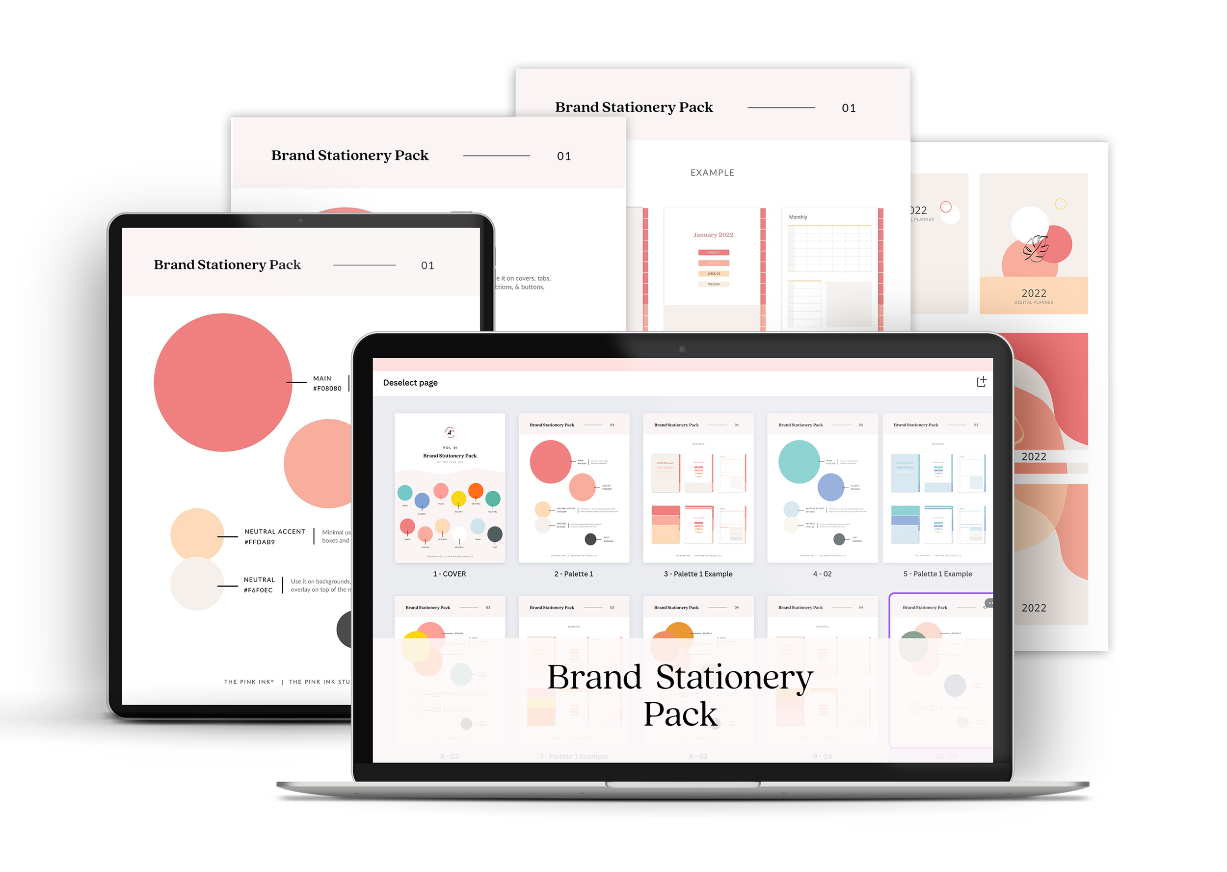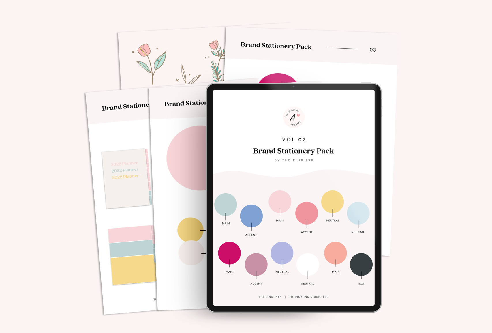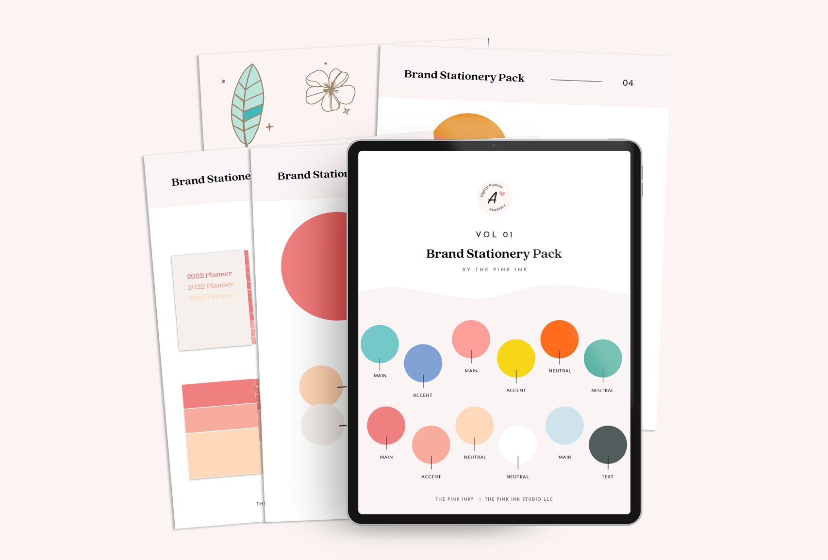 Brand Stationery Packs include 6 color palettes, a usage PDF guide, 45+ digital planner cover templates, and a bonus graphics set. They will help you decide on a color palette to use within your digital products for a consistent and professional online shop presence.
